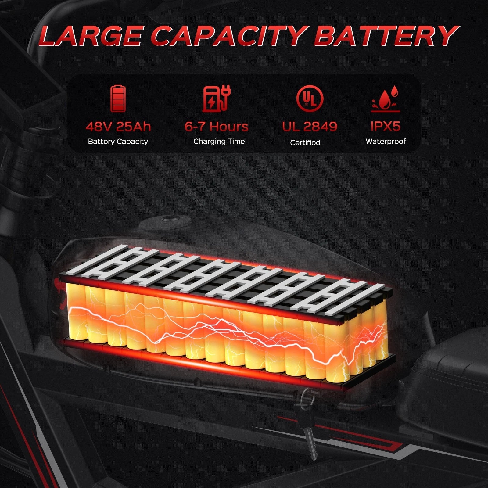 Equipped with a 48V 25Ah lithium battery, the WO18 offers an impressive range of 50–60KM per charge and a maximum speed of 55KM/H. Its dual suspension system and 20×4.5 inch off-road fat tires absorb shocks effectively, ensuring a stable and comfortable ride even on challenging paths.