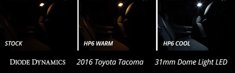 Features Direct replacement for factory 31mm festoon bulb Increased output with LED appearance Plug and play simple installation Overview Design. The 31mm HP6 LED bulb is a direct replacement for any 31mm-size bulb commonly found in door lights dome lights and trunk lights in many vehicles. Populated with eight high-power LEDs arranged in an omnidirectional pattern the HP6 upgrades the factory yellowish incandescent bulb to a more modern LED appearance while providing far more light output than the factory bulb. Thanks to the frosted cover the HP6 provides even light distribution and a clean factory-style appearance. With its durable metal terminals it will fit snugly in the socket and its light weight means it won't vibrate loose over time. Reliability. Unlike other bulbs on the market this bulb is built with constant-current circuitry along with transient suppression. That means this bulb will last for years not months with no flickering or failure. And like every Diode Dynamics product it's backed by an industry-leading three-year replacement warranty. Brightness. With 140 lumens of true measured output the HP6 LED will provide far more light output than your original 31mm-sized bulb. All Diode Dynamics LED lighting is rated with accurate measured lumen figures not calculations or guesses. We test the true output in-house and provide you the real numbers to compare. Colors. In addition to vibrant colors of blue and red the HP6 is available in a cool white 6000K option as well. Whether you want a modern cool white appearance or a color to show off your unique style we have the color to fit your need!