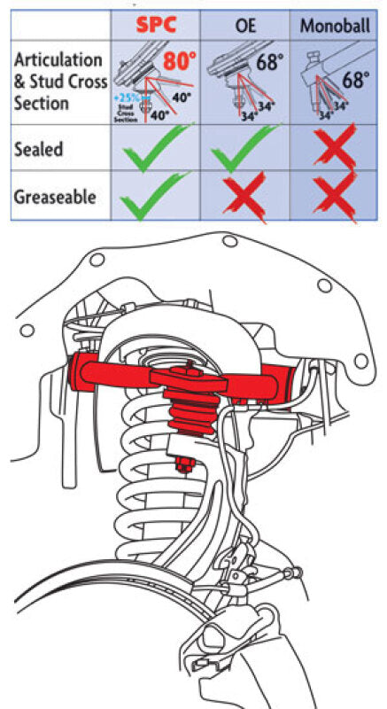 Improve droop travel, drivability and tire wear with SPC's adjustable front upper control arms. Fit bigger tires without rubbing fenders. Featuring a greasable ball joint and rubber isolated xAxis bushings, this arm is designed to correct alignment angles on standard height vehicles as well as lifted and lowered vehicles while maintaining factory ride quality. SPC's tube and plate arms are made in our facility in Colorado. Their proven design provides the strength and durability needed for the most demanding environments. These remove and replace arms are sold in pairs. - Get more droop travel: Don't let the OE ball joints or mono-ball articulation limit your travel. SPC joints are oversized and provide 80deg of travel. - Get your drivability and tracking back: Your truck may have started to 'wander' after you lifted it. That is because you lost caster. Install SPC arms and get your 'drivability' back by putting your alignment in specification. - Improve tire clearance: Are youroversized tires rubbing the fenders or frame rails? SPC Adjustable Arms, in combination with the OE adjustments on the lower arm, allow you to dial in alignment spcs at the same time that you move the tire forward/outward in the wheel well by up to 1". NOTE: For Rangers with aluminum knuckles ONLY California Residents WARNING